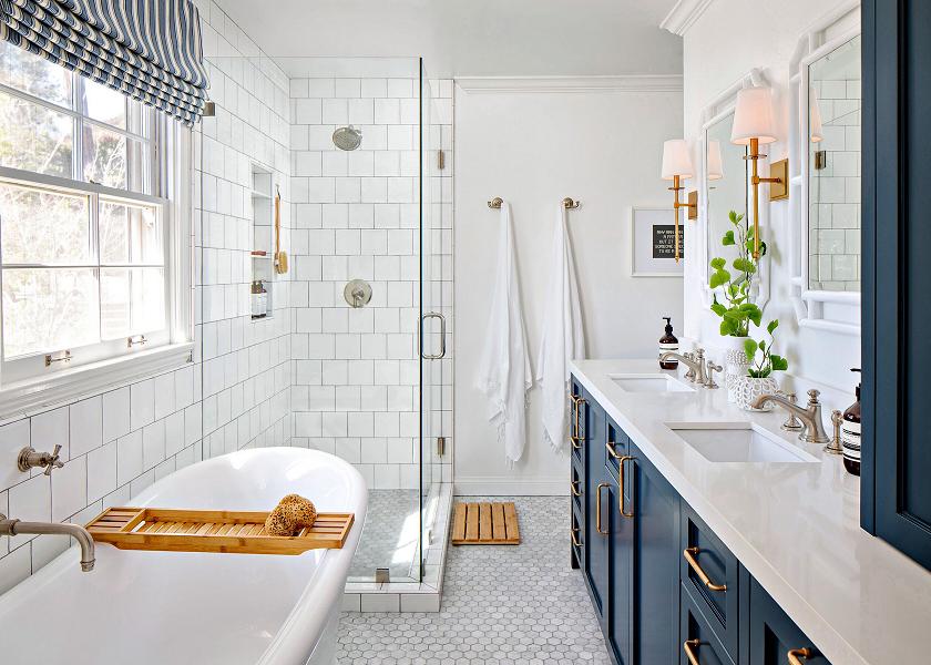 Supaya makin cozy, letakkan tanaman hijau dalam pot kecil serta bathtub caddy untuk tempat lilin aromaterapi atau sabun favoritmu, tambahkan pula rak ambalan untuk menambah kapasitas penyimpanan. Kamar mandi kecil tetap bisa memiliki daya tarik besar, kan?